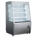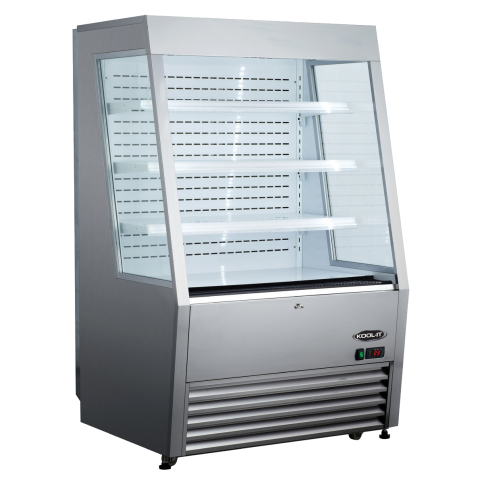Kool-It Refrigerated Display Case, 14 cu. ft., 36-1/5"W x 31-1/5"D x 57-1/2"H, self-service/open front, 35° to 40°F temperature range, electronic thermostat with digital display, white interior with (3) adjustable shelves, LED lighting, night curtain, automatic defrost, stainless steel exterior, bottom mount self-contained refrigeration, (4) 2" casters (2) locking, R290 Hydrocarbon refrigerant, 115v/60/1-ph, 11.6 amps, cord with NEMA 5-15P, cETLus, ETL-Sanitation