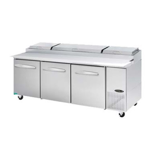 Kool-It Signature Pizza Prep Table, three-section, 30.8 cu. ft. capacity, 93-3/10"W x 36-1/2"D x 42", 33-40° temperature range, raised pan rail with insulated lids, includes (12) 1/3 poly food pans, removable polyethylene cutting board, (3) solid hinged door, (6) adjustable shelves, stainless steel interior & exterior, (4) 5" swivel casters (2 braked), automatic defrost, side mounted self-contained refrigeration, R290 refrigerant, 1/4 HP, 115v/60/1-ph, 3.5 amps, cord, NEMA 5-15P, cETLus, ETL-Sanitation