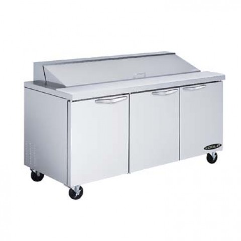 Kool-It Signature Sandwich/Salad Prep Unit, three-section, 20.2 cu. ft. capacity, 72-2/5"W x 30"D x 42-3/5"H, 33-40°F temperature range, insulated lid opening for (18) 1/6 pans (4" deep pans included, can accommodate 6" deep pans), removable cutting board, (3) solid hinged doors, (3) adjustable shelves, stainless steel interior & exterior, (4) 4" swivel casters (2 braked), rear mounted self-contained refrigeration, R290 refrigerant, 1/4 HP, 115v/60/1-ph, 5.3 amps, cord, NEMA5-15P, cETLus, ETL-Sanitation