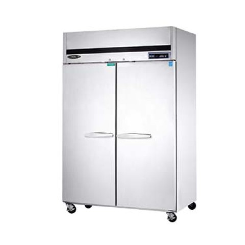 Kool-It Signature Freezer, reach-in, two-section, 43 cu. ft. capacity, 53-9/10"W x 32-3/4"D x 81-4/5"H, (2) solid doors, door locks with keys, open door alarm, (6) adjustable shelves, accommodates full-size sheet pans, LED interior lighting, digital temperature display, automatic defrost, stainless steel interior & exterior, (4) swivel 4" casters (2 braked), top mounted self-contained refrigeration, R290 refrigerant, 1/2 HP, 6.8 amps, 115v/60/1-ph, cord with NEMA 5-15P, cETLus, ETL-Sanitation, ENERGY STAR®