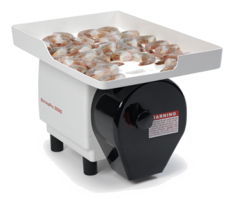 ShrimpPro® 2000 Power Shrimp Cutter & Deveiner™, includes feeder tray, S,M,L depth rollers, lubricant, and (2) 9-1/16" blade wrenches, 4,000 to 6,000 pieces per hour, cut, butterfly or split, removes vein, ETL