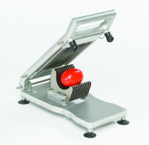Roma Tomato Slicer, 1/4" slice, razor-sharp blades, pretensions scalloped blade assembly, cast aluminum frame, suction-cup feet, NSF