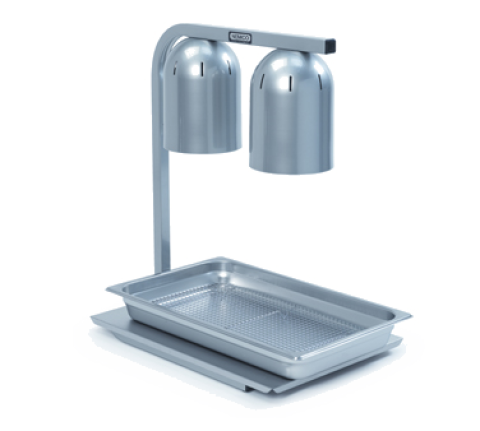 Heat Lamp, freestanding, infrared, two bulb, 120v/60/1ph, 500 watts, steel frame and aluminum hoods, white 250 watt infrared bulbs standard (optional: red 250 watt infrared bulbs or white shatter-resistant 250 watt bulbs), with pan & screen set, UL, NSF