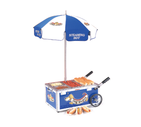 Hot Dog Steamer Cart, mini, counter top, adjustable thermostat 120°F to 212°F, cycling indicator pilot light, temperature indicator, includes: umbrella, pans & lids, stainless steel construction, blue, 120V, 1200 watts, 10 amps, NEMA 5-15P, NSF, UL, CUL