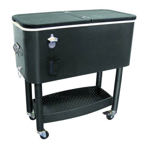 Update Internationalâ„¢ - Cooler Cart, 16-1/4 gal (65 quart), 31-1/8"L x 15-3/8"W x 10-3/8"H (32-2/3"H on stand), mobile, double hinged lid, stainless steel loop handles, built-in stainless steel bottle opener with cap catcher, undershelf (23-5/8"L x 10-5/8"W x 3"H), drain plug, polyethylene interior, steel exterior, 3" swivel casters (2 locking), black