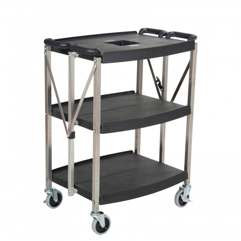 Focus Foodservice - Storage/Transport Folding Bus Cart, 350 lb. weight capacity, 28" x 19" x 36" (8"W footprint when folded), heavy duty, (3) textured polymer shelves, marine edge, (2) ergonomic handles, locks in the folding position, stainless steel uprights, (4) 4" heavy duty swivel casters (2 with brakes), black (fully assembled) (retail packaged)