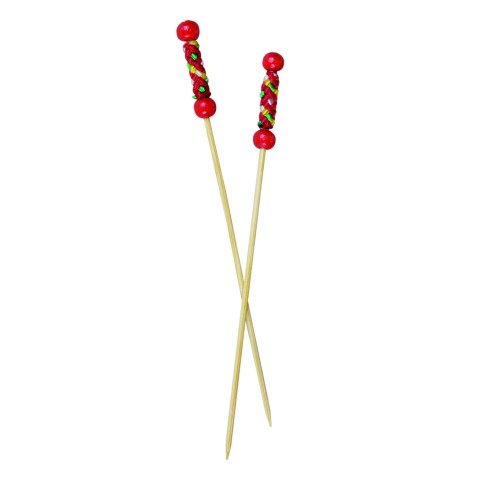 Fuji Pick, 4.7", with natural beads and red design, freezer safe, reusable, compostable, biodegradable, bamboo, (Per case = 2000 each)