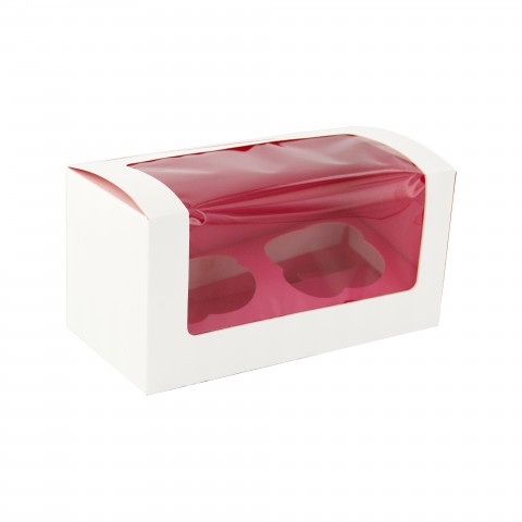 Cupcake Box, 6.8" x 3.3" x 3.3"H, rectangular, pink insert included, 2 piece capacity, with window, freezer safe, recyclable, paper, white, (Per case = 100 each)