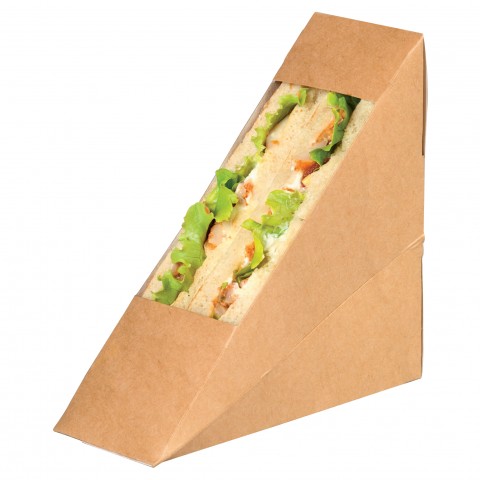 Sandwich Wedge Box, 4.8" x 2" x 4.8"H, triangular, double, with window, freezer safe, recyclable, Kraft paper, brown, (Per case = 500 each)