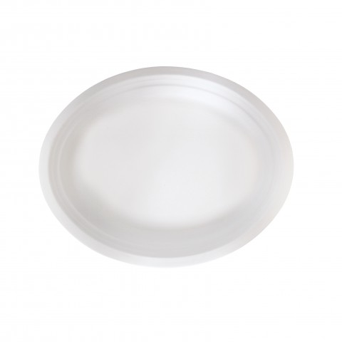 Plate, 12.2" x 9.4", oval, microwavable, grease resistant, freezer safe, reusable, compostable, biodegradable, sugarcane, white, case quantity = 500 (25 each per pack, 20 packs per case)