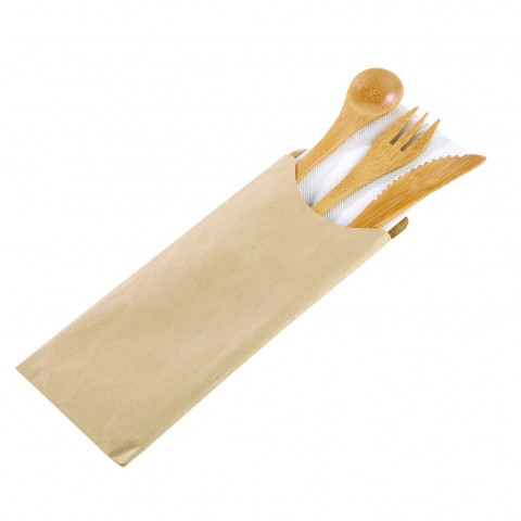 Cutlery 4/1 Kit, 6.3", includes: (1) knife, (1) fork, (1) spoon & (1) napkin, wrapped in Kraft paper, freezer safe, reusable, compostable, biodegradable, bamboo, natural, (Per case = 250 each)
