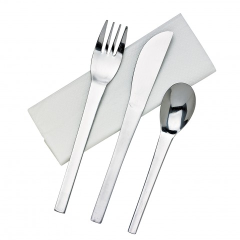 Cutlery Kit, 4/1, includes: knife, fork, spoon & napkin, wrapped in polypropylene bag, reusable, stainless steel, (Per case = 50 each)