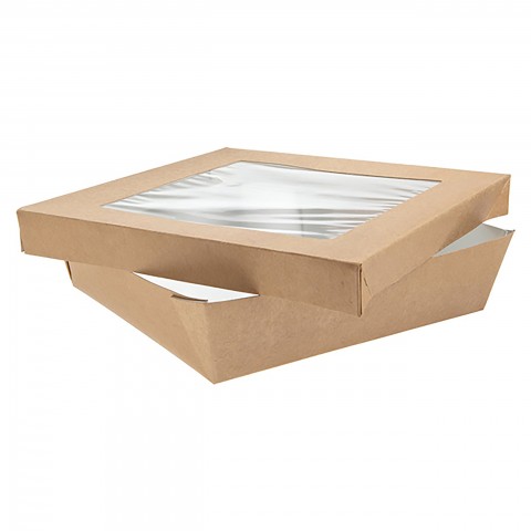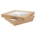 Kray Take Out Box, 60 oz., base: 7.1" x 7.1" x 2", lid: 8.1" x 8.1", square, with steam proof window, microwaveable base, grease resistant, freezer safe, recyclable, Kraft paper, brown, (Per case = 200 each)