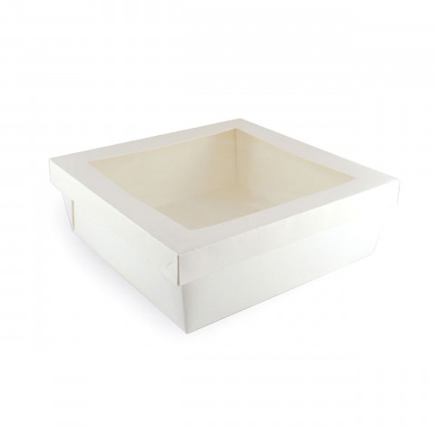Kray Take Out Box, 132 oz., base: 8.7" x 8.7" x 3.2", lid: 9.2" x 9.2", square, with steam proof window, microwavable base, grease resistant, freezer safe, recyclable, paper, white, (Per case = 100 each)