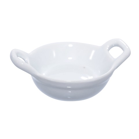 Eco Casserole Dish, 1 oz., 2.5" dia. x 1"H, mini, round, with handles, reusable, heat resistant up to 350°F (180°C), porcelain, white, (Per case = 24 each)