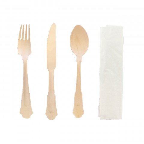 Elegant Cutlery Set, 4-piece, 6.5", includes: (1) fork, (1) spoon, (1) knife, and (1) napkin, recyclable, compostable, biodegradable, wood, natural, (Per case = 100 each)