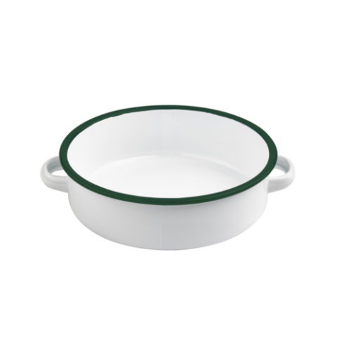 Dish with Handles, 34 oz., 7.1"dia. x 2"H, white with green rim, enamel, (Per case = 12 each)