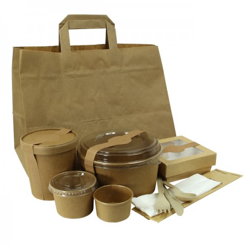 VIP Set, Includes: (4) Kraft/brown paper carrier bag - L:12.5 x W:8 x H:9.6in - 250 pcs (210CABTRBR), (1) Brown Kraft Hot & Cold Paper Cup - 2.3oz - 1000 pcs (210POB61), (1) Clear PET Flat Lid for 210POC60N & 210POB61 & 210GPU7(BR) - 2.44 x 0.31in - 2500 pcs (209POPETL2), (4) Compostable Bamboo Fiber 4/1 Cutlery Kit With Kraft Bag (Knife, Fork, Spoon, Napkin) - 6in - 250 kits (210CVPLK416BB), (2) Kraft Self-Adhering Paper Wrapper - 15.75in - 500 pcs (210LAP40), (2) Brown Kraft Soup Cup with Kraft Lid Included - 8oz D:3.375in H:2.4in - 500 pcs (210SOUPCOK8), (3) Buckaty Round Kraft To Go Container - 24oz D:5.9in H:2.4in - 360 pcs (210PC751K), (3) Clear PP Lid - D:5.9in - 360 pcs (210SOUPLPP157), (4) Kraft Kray Boxes with PET Window Lid - 22oz 4.7 x 4.7 x 2in - 250 pcs (210KRAYB135)