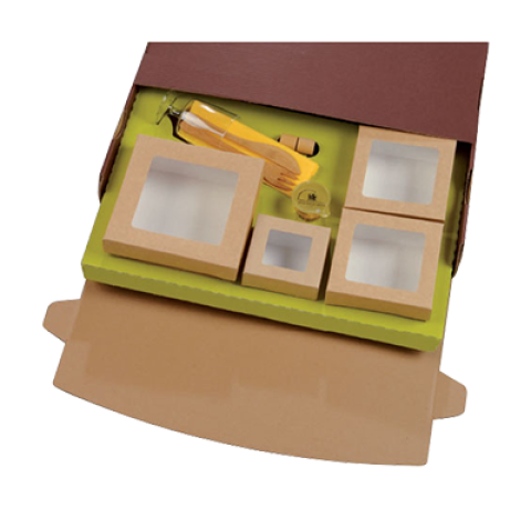 VIP Meal Kit, includes: (100) 210VIPCOFCH brown cardboard tray, (100) 210TRAKRAY green insert, (100) 210KRAYB85 Kraft box, (250) 210KRAYB115 12 oz. takeout box, (100) 210KRAYB155 Kraft box, assembly required, ships in 11 cases (priced per lot, 100 kits per lot)