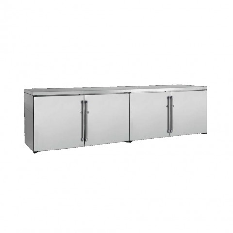 Low Profile Refrigerated Back Bar Cabinet, four-section, 96"W, remote refrigeration, 27.0 cu.ft. interior volume, (4) hinged doors with locks, LED interior lighting, field-plumbed condensate evaporator, stainless steel interior, NSF, cULus