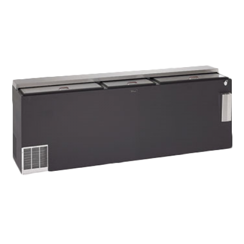 Bottle Cooler, flat top, 96” W, self-contained refrigeration, (28.3) cu. ft. interior capacity, digital temperature control & display, 38°F factory temperature setting, (3) dent-resist and stainless steel doors with lock & die-cast handles, automatic condensate evaporator, stainless steel top & interior, R290 Hyrdrocarbon refrigerant, 1/4 HP, 120v/60/1-ph, 4.4 amps, NEMA 5-15P, NSF, cULus