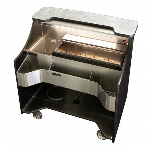 Signature Mobile Bar, 42" total bartending width, 30" ice chest, 12" insulated bottle well, 42" curved speed rail, LED bartender task lighting, ice melt drain tank, stainless steel & laminated wood construction, (4) 5" stainless steel casters (locking), 120v/60/1-ph, 0.3 amps, NEMA 5-15P, NSF