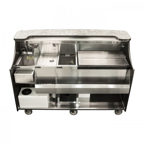 Mobile Bar, with hand sink, 66" total bartending width, 30" ice chest, 12" insulated bottle well, (1) 12" drainboard, 54" speed rail, 12" hand sink, LED bartender task lighting, 1.5 gallon water heater, water pump, fresh water tank, grey water tank, ice melt drain tank, 5" stainless steel casters (locking), 120v/60/1-ph, 13.3 amps, NEMA 5-15P, NSF