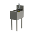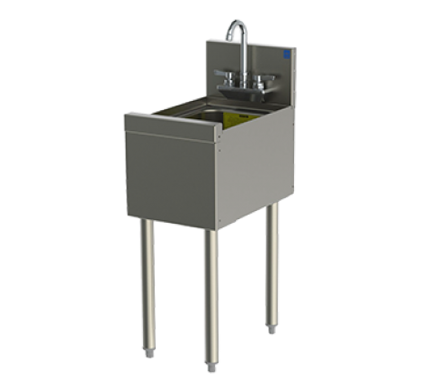 TS Series Underbar Wet Waste Sink Unit, 12"W x 18-9/16"D, 10" wide x 14" front-to-back x 9-1/4" deep 18 gauge stainless steel sink, backsplash, 4" OC splash mount faucet holes, 1-1/2" NPS male drain, stainless steel construction, Perlick Quick Clamp tool less leg attachment, stainless steel legs with 1" adjustable thermoplastic feet (replaces TS12HS)