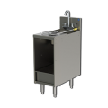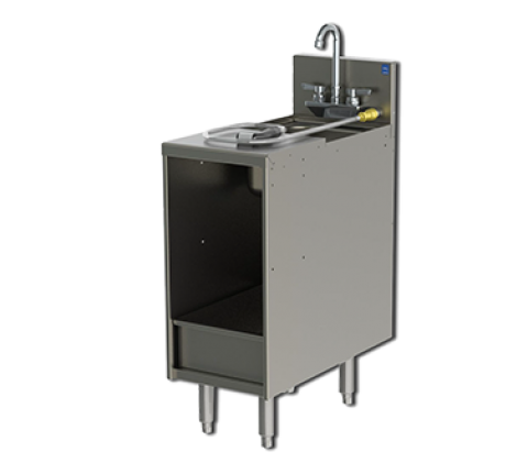 TSF Series Underbar Chemical Storage Cabinet, 12" W x 24"D, 18 gauge stainless steel sink with removable perforated wet waste pan, quick disconnect spray hose, water tight stainless steel chemical storage pan, stainless steel construction, stainless steel legs with adjustable thermoplastic feet (replaces 7057-3)