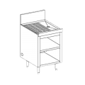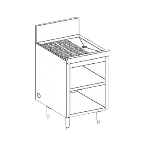Underbar Storage Cabinet 12"W x 24"D, 4" or 6"H backsplash with 1" return at top, pitched drainboard top with 1-1/2" NPS drain socket with 1/2" OD barb & 1/2" ID anti-microbial tubing, 1-1/2" NPS male drain center back of cabinet bottom, (1) adjustable intermediate shelf, stainless steel construction, Perlick Quick Clamp stainless steel legs & adjustable feet, NSF Listed (replaces SC12)