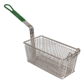 Frequent Fryer® Fry Basket, 6-1/2"W x 13-1/4"D x 5-13/16"H, front hook, nickel plated wire mesh, green plastisol handle, NSF (must be ordered in multiples of 5), each