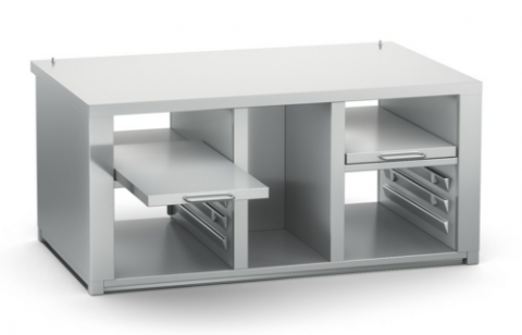 Stand, 43-1/4"W x 35-3/8"D x 18-1/8"H, (2) pull out shelves, (6) pairs of 1/1 GN supporting rails, top & side panels, open rear, for size 2-S (MUST choose feet below)