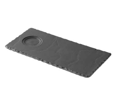 (BA0525) Tray, 9-3/4" x 4-3/4" x 1/4"H, rectangular, with 2" dia. espresso/cappuccino cup indent, safe for oven, microwave, freezer & dishwasher, flake & scratch resistant, non-porous porcelain, matt slate style, Basalt (US stocked item)