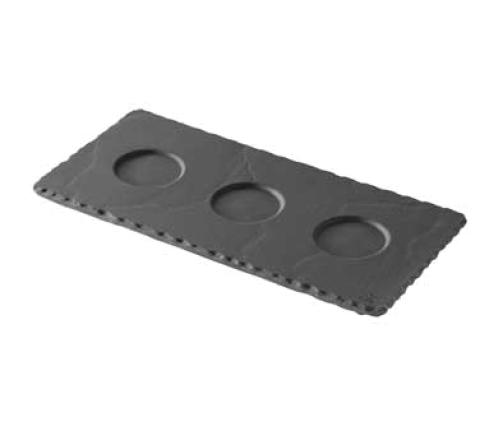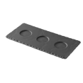 (BA0725) Tray, 9-3/4" x 4-3/4" x 1/4"H, rectangular, with (3) 1/1/2" dia. indents, safe for oven, microwave, freezer & dishwasher, flake & scratch resistant, non-porous porcelain, matt slate style, Basalt