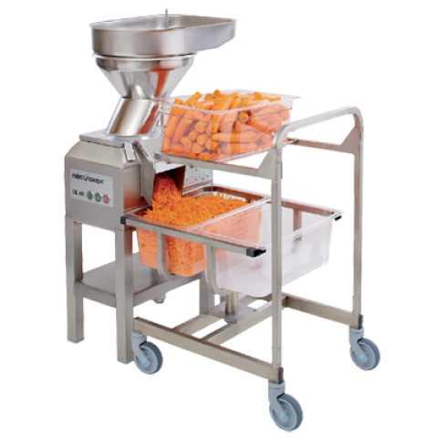 Commercial Food Processor Workstation, floor model, produces up to (3970) lbs./hr, includes: vegetable prep attachment with 16-disc MultiCut pack, dice cleaning kit (39881), 3mm mashed potato kit, 4.2 liter capacity pusher feed-head with integrated cylindrical hopper, automatic stainless steel feed-head, 4-tubes feed-head, ergo mobile cart with rotating lower shelf & (3) 1/1 GN containers, storage cart, (2) sets of wall mounted disc racks (holds 16 discs), stainless steel container for cutting tools, adjustable foot, handle and 2 casters, induction motor with stainless steel motor base, two speeds (425 & 850 RPM), 3 HP, 208-240v/60/3-ph, 6.5 amps, NEMA L15-20P, cETLus, ETL-Sanitation