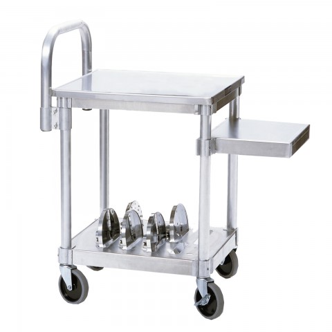 R199 - Robot-Cart Equipment Stand, 18-9/16"W x 34-1/8"D x 38-1/2"H, adjustable handle, adjustable aluminum cantilever shelf (adjusts from 10-3/16" to 27-1/2"H), stainless steel insert shelving with (10) cutting disc slots, includes (1) 5/32" Allen wrench for assembly/disassembly, 5" heavy duty swivel casters (200 lb capacity), heavy duty aluminum construction (discs not included)