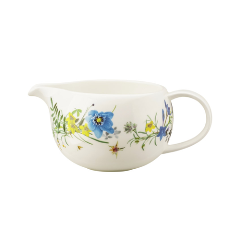 Creamer, 10-3/4 oz., 6-1/8" dia., 6-1/8"L x 4"W x 2-7/8"H, round, with handle, scratch-resistant, microwave and dishwasher safe, bone china, white, with floral decoration, Rosenthal, Rosenthal, Brillance Fleurs des Alpes
