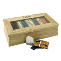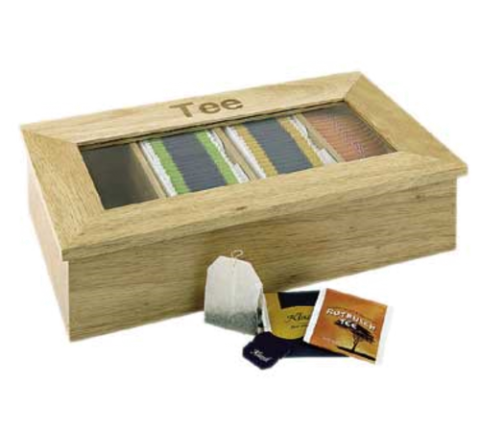 Tea-Box, 13-1/8" x 7-7/8", 3-1/2"H, 4 compartment, with "Tee" engraving and window, wood (Special Order Item)