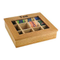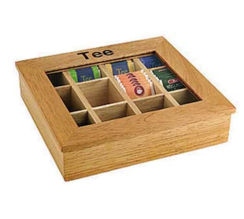 Tea-Box, 12-1/4" x 11" x 3-1/2"H, 12 compartment, with "Tee" engraving and window, wood (Special Order Item)