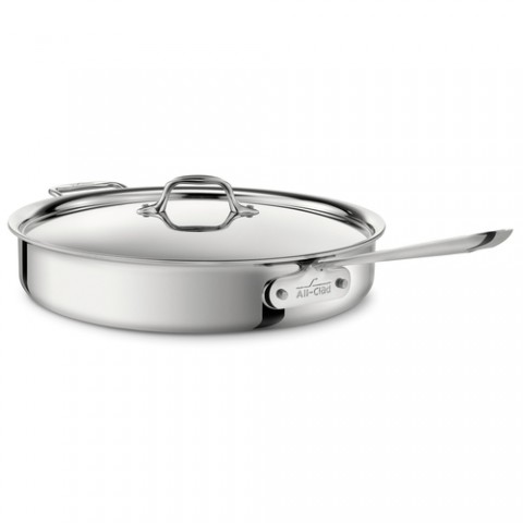 Sauté Pan, 6 qt., 13-4/5" dia. x 5-3/5" H, with lid, riveted handles, induction capable, tri-ply construction, 18/10 stainless steel and aluminum, mirror finish, All-Clad, Stainless Collection (Special Order Item)