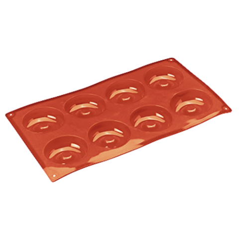 Savarin Mold, 1.38 oz., (8) 2-1/2" dia. x 7/8"H molds, 11-7/8"L x 6-7/8"W O.A., flexible, temperature resistance -40° F to 500° F, reusable, dishwasher suitable, microwave safe, non-stick, silicone, red, Paderno, Bakeware (Special Order Item)