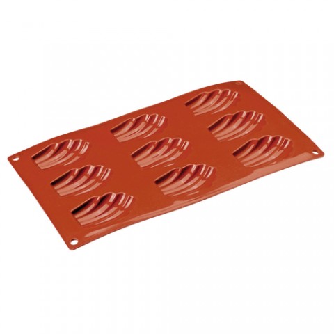 Mold, Madeleine, 1.13 oz., (9) 2-5/8"L x 2"W x 5/8"H molds, 11-7/8"L x 6-7/8"W O.A., flexible, temperature resistance -40° F to 500° F, reusable, dishwasher suitable, microwave safe, non-stick, silicone, red, Paderno, Bakeware