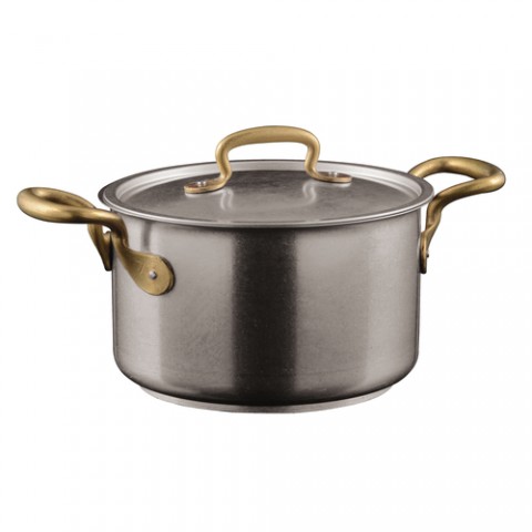 Sauce Pan, 4 qt., 7-7/8" dia., with lid, (2) riveted brass handles, induction capable, dishwasher suitable, 18/10 stainless steel, 1965 Vintage Cookware