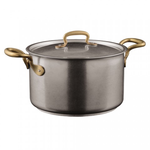 Sauce Pan, 6-4/5 qt., 9-1/2" dia., with lid, (2) riveted brass handles, induction capable, dishwasher suitable, 18/10 stainless steel, 1965 Vintage Cookware