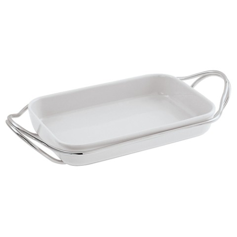 Oven Dish, 15-7/8"W x 10-5/8"D, rectangular, with holder, dishwasher suitable, porcelain, 18/10 stainless steel, silver-plated, New Living, white (Special Order Item)