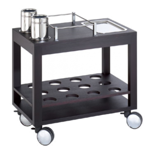 Wine & Liqueur Trolley, 50 lb. capacity, 33-1/2" x 19-5/8" x 35-7/8", includes: 2 bottle coolers, 1 tray, upper deck with bottle/glass, holder ring, lower deck with bottle rack, oak finish, 18/10 stainless steel, Sambonet, Tokyo S/S (Special Order Item)