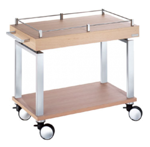 Serving Trolley, 90 lb. capacity, 47-1/4" x 23" x 35-7/8", lower deck with wooden barrier, oak finish, 18/10 stainless steel, Sambonet, New York S/S (Special Order Item)