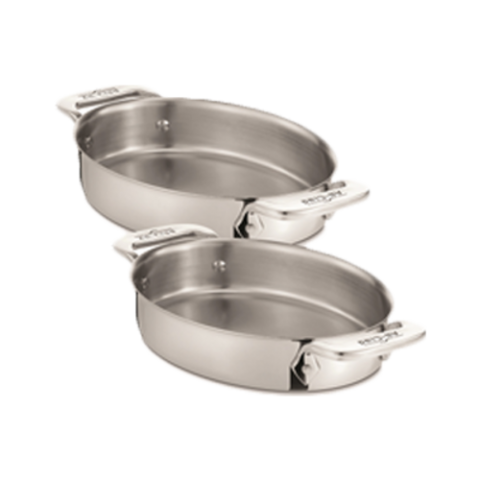 Bakers, 22 oz., 7" x 1-1/2" H, oval, riveted handles, induction capable, tri-ply construction, 18/10 stainless steel and aluminum, mirror finish, All-Clad, Specialty Cookware (set of two) (Special Order Item)