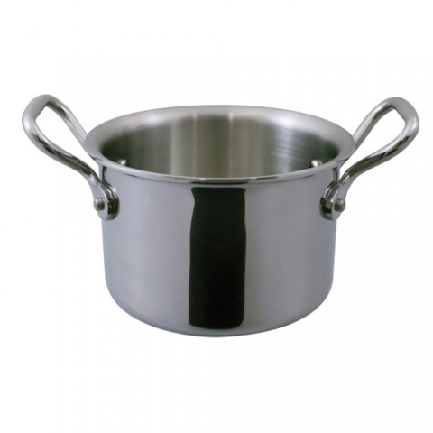 Mini Sauce Pot, 20 oz., 4" dia. x 2-3/4"H, without lid, induction ready, riveted handles, dishwasher safe, tri-ply stainless steel & aluminum, mirror polished finish, Paderno, Mini S/S Cookware