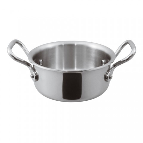 Mini Rondeau Pan, 12 oz., 4" dia. x 1-3/4"H, without lid, induction ready, riveted handles, dishwasher safe, tri-ply stainless steel & aluminum, mirror polished finish, Paderno, Mini S/S Cookware (Special Order Item)